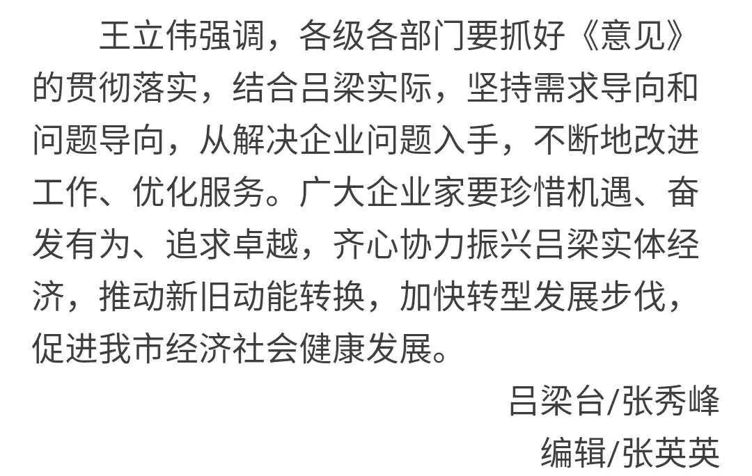 導(dǎo)語(yǔ):10月13日,市委書(shū)記李正印主持召開(kāi)我市深入學(xué)習(xí)貫徹落實(shí)中共中央、國(guó)務(wù)院《關(guān)于營(yíng)造企業(yè)家健康成長(zhǎng)環(huán)境弘揚(yáng)優(yōu)秀企業(yè)家精神更好發(fā)揮企業(yè)家作用的意見(jiàn)》(下稱(chēng)《意見(jiàn)》)座談會(huì),共商呂梁經(jīng)濟(jì)發(fā)展大計(jì)。市長(zhǎng)王立偉、市人大常委會(huì)副主任梁來(lái)茂、副市長(zhǎng)楊巨才出席會(huì)議。9大產(chǎn)業(yè)13個(gè)行業(yè)協(xié)會(huì)負(fù)責(zé)人參加會(huì)議。