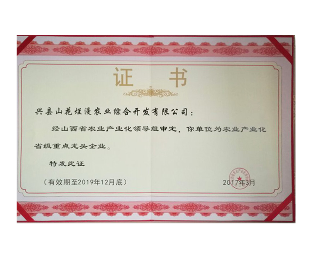 興縣山花爛漫農(nóng)業(yè)綜合開發(fā)有限公司是山西省農(nóng)業(yè)產(chǎn)業(yè)化重點龍頭企業(yè),公司成立于2008年,法人代表賀虎平,注冊資本1000 萬元,現(xiàn)有員工 30 人。